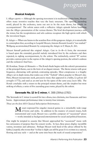 One might be tempted to assume that Mozart approached his “occasional” music with less seriousness of purpose than his concert works. In fact, these pieces display incredible variety, invention and substance. Perhaps Mozart took heed of the advice offered by his father, Leopold, who wrote that “(w)hat is slight can still be great if it is written in a natural, flowing and easy style — and at the same time bears the mark of sound composition.” Atlanta’s Performing Arts Publication 23