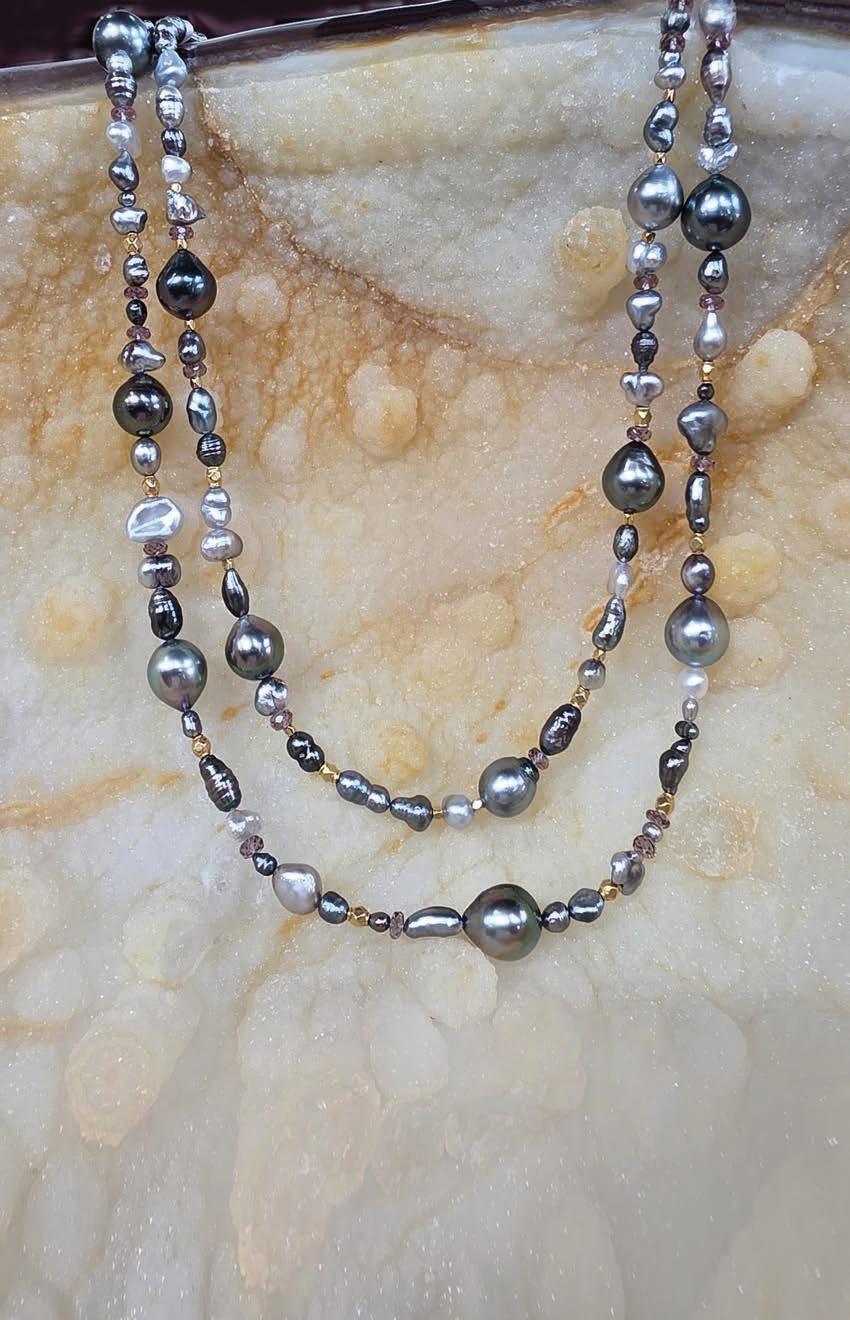 MSA custom pearl necklaces with beautiful Tahitian and natural Keshi pearls, garnets, and high karat gold.