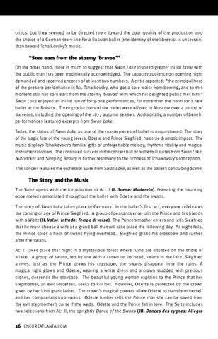 “Sore ears from the stormy ‘bravos’” On the other hand, there is much to suggest that Swan Lake inspired greater initial favor with the public than has been traditionally acknowledged. The capacity audience on opening night demanded and received encores of at least two numbers. A critic reported: “the principal hero of the present performance is Mr. Tchaikovsky, who got a sore waist from bowing, and to this moment still has sore ears from the stormy ‘bravos’ with which his delighted public met him.” Swan Lake enjoyed an initial run of forty-one performances, far more than the norm for a new ballet at the Bolshoi. Three productions of the ballet were offered in Moscow over a period of six years, including the opening of the 1877 autumn season. Additionally, a number of benefit performances featured excerpts from Swan Lake. Today, the status of Swan Lake as one of the masterpieces of ballet is unquestioned. The story of the tragic fate of the young lovers, Odette and Prince Siegfried, has true dramatic impact. The music displays Tchaikovsky’s familiar gifts of unforgettable melody, rhythmic vitality and magical instrumental colors. The continued success in the concert hall of orchestral suites from Swan Lake, Nutcracker and Sleeping Beauty is further testimony to the richness of Tchaikovsky’s conception. This concert features the orchestral Suite from Swan Lake, as well as the ballet’s concluding Scene.