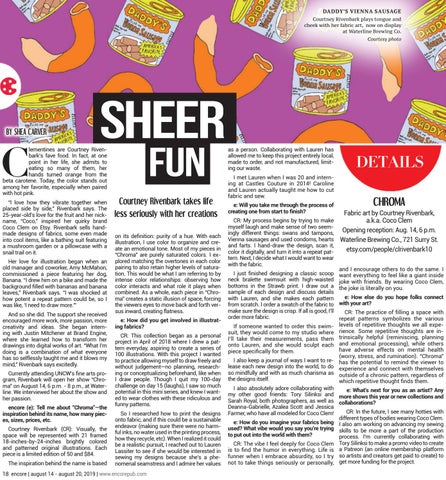 lementines are Courtney Rivenbark’s fave food. In fact, at one point in her life, she admits to eating so many of them, her hands turned orange from the beta carotene. Today, the color stands out among her favorite, especially when paired with hot pink. “I love how they vibrate together when placed side by side,” Rivenbark says. The 25-year-old’s love for the fruit and her nickname, “Coco,” inspired her quirky brand Coco Clem on Etsy. Rivenbark sells handmade designs of fabrics, some even made into cool items, like a bathing suit featuring a mushroom garden or a pillowcase with a snail trail on it. Her love for illustration began when an old manager and coworker, Amy McMahon, commissioned a piece featuring her dog, Banana. “I drew him on a bike and made the background filled with bananas and banana leaves,” Rivenbark says. “I was shocked at how potent a repeat pattern could be, so I was like, ‘I need to draw more.’” And so she did. The support she received encouraged more work, more passion, more creativity and ideas. She began interning with Justin Mitchener at Brand Engine, where she learned how to transform her drawings into digital works of art. “What I’m doing is a combination of what everyone has so selflessly taught me and it blows my mind,” Rivenbark says excitedly. Currently attending UNCW’s fine arts program, Rivenbark will open her show “Chroma” on August 14, 6 p.m. - 8 p.m., at Waterline. We interviewed her about the show and her passion. encore (e): Tell me about “Chroma”—the inspiration behind its name, how many pieces, sizes, prices, etc. Courtney Rivenbark (CR): Visually, the space will be represented with 21 framed 18-inches-by-24-inches brightly colored and patterned original illustrations. Each piece is a limited edition of 50 and $84. The inspiration behind the name is based