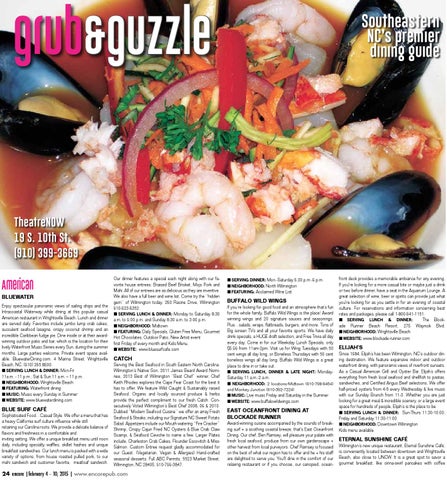 American BLUEWATER Enjoy spectacular panoramic views of sailing ships and the Intracoastal Waterway while dining at this popular casual American restaurant in Wrightsville Beach. Lunch and dinner are served daily. Favorites include jumbo lump crab cakes, succulent seafood lasagna, crispy coconut shrimp and an incredible Caribbean fudge pie. Dine inside or at their awardwinning outdoor patio and bar, which is the location for their lively Waterfront Music Series every Sun. during the summer months. Large parties welcome. Private event space available. BluewaterDining.com. 4 Marina Street, Wrightsville Beach, NC. (910) 256.8500. ■ SERVING LUNCH & DINNER: Mon-Fri 11a.m. - 11 p.m.; Sat & Sun 11 a.m. – 11 p.m. ■ NEIGHBORHOOD: Wrightsville Beach ■ FEATURING: Waterfront dining ■ MUSIC: Music every Sunday in Summer ■ WEBSITE: www.bluewaterdining.com