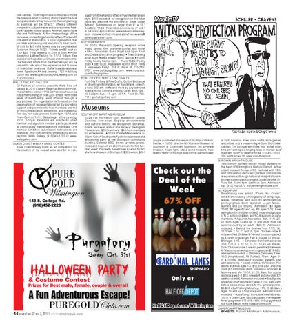 Museums SOUTHPORT MARITIME MUSEUM 10/28: Fall into History tour , Museum of Coastal Carolina, 9am-noon. Explore environmental and cultural history, ee ecosystem dioramas, fossils, and even a short star show at the Ingram Planetarium. $35/members, $45/non-members for entire series. • 10/29: Pyrate Masquerade, 610pm. Kick off Southport’s Pyrate Invasion weekend w/costume party at the Southport Community Building. Catered BBQ dinner, pyrates, prizes, music and mayhem are all on the menu for this funfilled event. Proceeds benefit new location for NC Maritime Museum at Southport. $35/person, $60 /