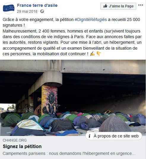 Face aux conditions d’extrême précarité dans ces camps, France terre d’asile et la Fédération des acteurs de la solidarité ont lancé une pétition pour demander une opération de mise à l’abri humanitaire d’urgence garantissant un hébergement digne, dans la durée, avec un accompagnement social et sanitaire. Signée par plus d’une trentaine d’associations et plus de 30 000 personnes, elle a permis, au mois de mai 2018, puis tout au long de l’été, la mise en œuvre d’opérations de démantèlement de ces campements et la mise à l’abri des personnes à la rue.
