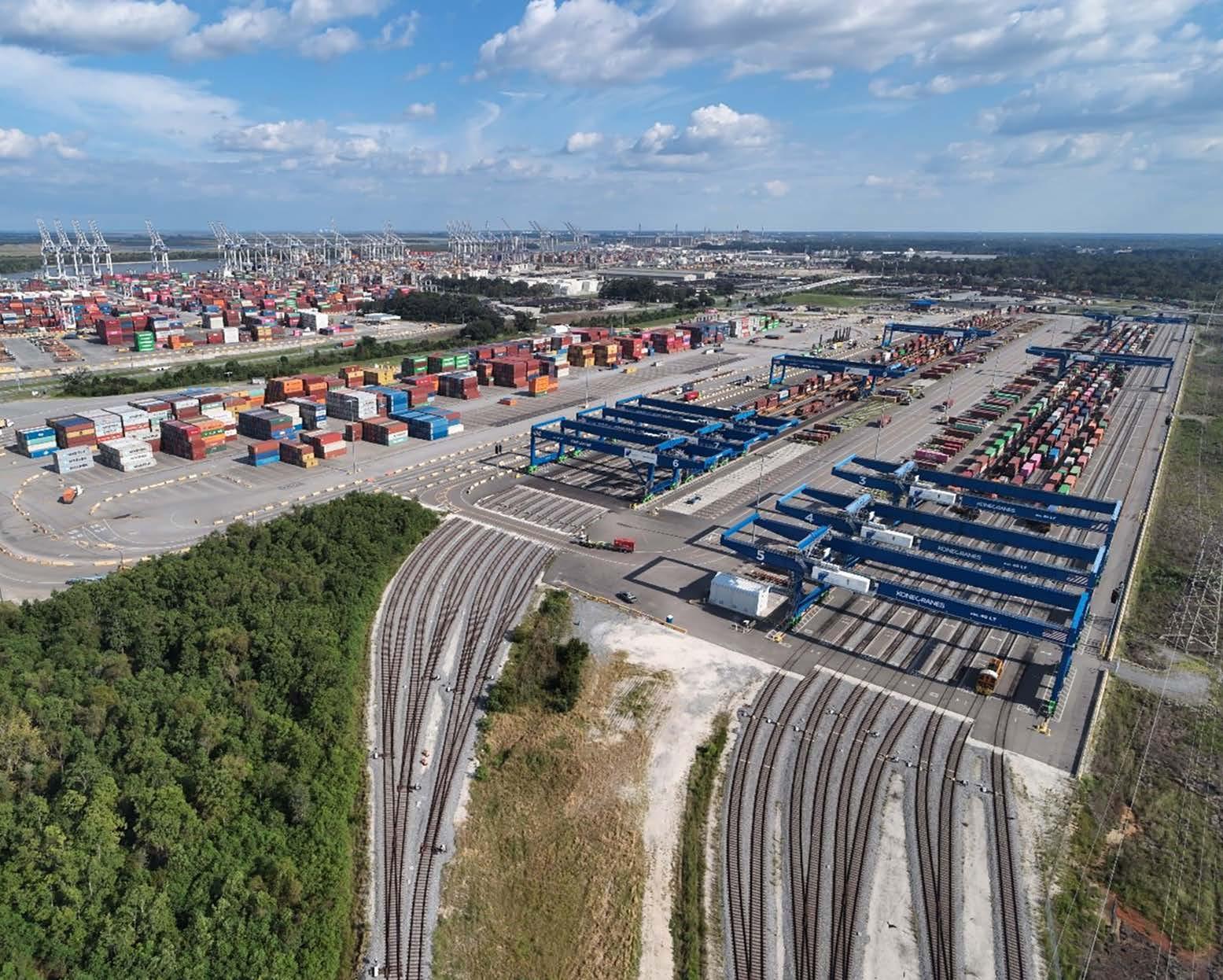 largest and fastest growing container terminal in North America. GCT spans a 1,345-operator terminal set on providing quick and easy connections to global markets whilst facilitating seamless supply chains on both a local and international level. The facility encompasses 36 high-speed container cranes and 158 rubber-tired gantry cranes, which are served by Interstate 16 (I-16) travelling from east to west, and Interstate 95 (I-95) travelling from north to south. The interstate routes allow the port to play a pivotal role in delivering cargo along major transport routes travelling across the country. This is valuable as it means many manufacturing hubs in the Southeast and Midwest can be reached via the port in just a couple of days’ drive, and so the port’s interconnected nature with the country’s transport network makes it a clear choice for moving cargo from international markets and across the country. However, the connected nature of GCT does not end there, and in fact, the terminal is also served by a Class I railway service via CSX Transportation and Norfolk Southern Railroad. These rail network links provide a 2–5-day double-stack rail service that is
