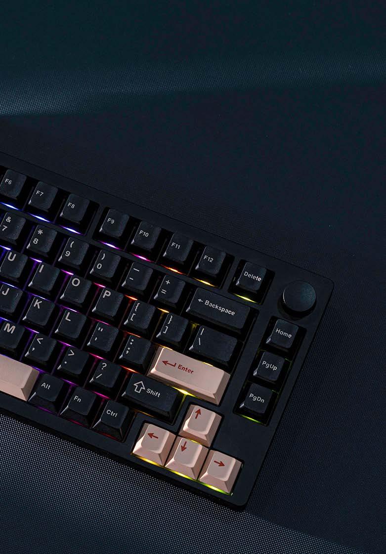 With every keyboard I try from EPOMAKER I’m consistently impressed, and the P75 Mechanical Keyboard is no exception. With most keyboards I’ve tried however, I’m usually celebrating its lightweight design and easy portability, but with the P75 its main draw is its durable and wear-resistant design. The resulting keyboard feels extremely premium with a weighty finish – not something I ever thought I’d need from a keyboard, but I am delightfully surprised. In addition to its heavy design, the keyboard comes in all black with only the space, arrow, escape and enter keys in a lovely peachy pink colour. I loved the contrast between these two and the overall minimalist look it gave the keyboard. However, the keyboard also has south-facing RGB backlighting adding yet another nice aesthetic touch. The overall size is 75% of a normal keyboard making it a little more compact than the traditional size, but this aims to help streamline typing by reducing the amount of hand and finger movement needed to reach each key. One of the other innovative