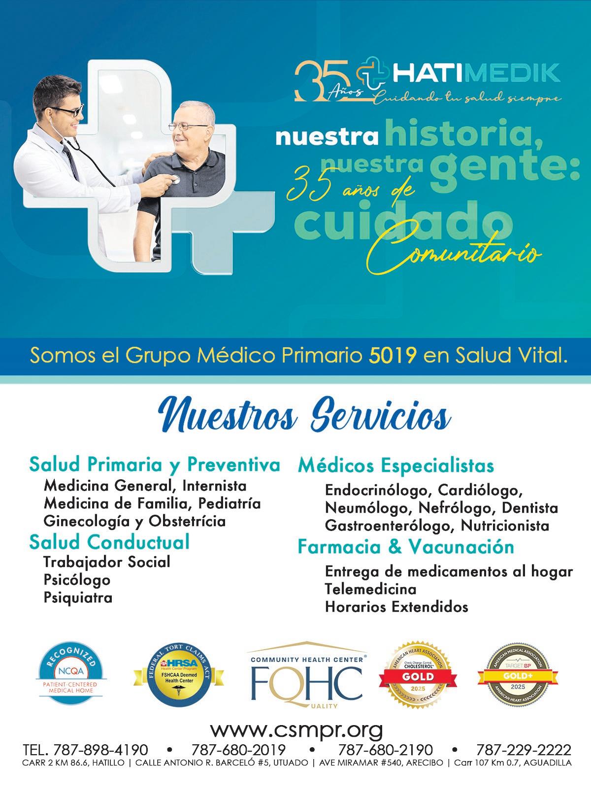 atimedik, Corporación deServicios Médicos, continúa fortaleciendo la salud comunitaria mediante un cuidado primario y preventivo integral. Sus servicios destacan por la variedad de especialidades cruciales, incluyendo Medicina General, Pediatría,Ginecología, Salud Conductual (Trabajo Social,Psicología y Psiquiatría) e Internista, además de contar con farmacia y telemedicina. Con el compromiso dela accesibilidad, Hatimedik opera sus clínicasen Hatillo, Utuado,Arecibo y Aguadilla. Complementariamente, suClínica Móvil lleva cuidado a las comunidades, asegurandoque las familias reciban serviciosde altacalidad,sin importar su capacidad de pago.