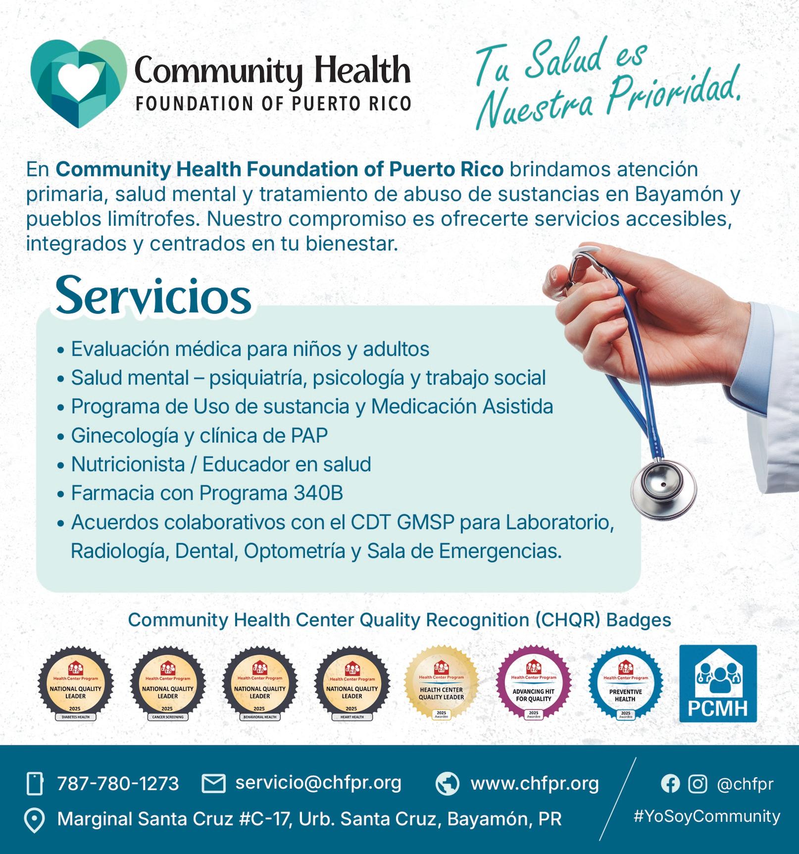 En un momento donde la atención médica accesible y de calidad es esencial, Community Health Foundation ofPuerto Rico(CHFPR) reafirmasu compromisocon lacomunidad deBayamón ylos municipios limítrofes. Como Centro de Salud CalificadoFederalmente (FQHC, porsus siglasen inglés),la organización ofreceservicios médicos esenciales demedicina primaria,salud mental,tratamiento para uso de sustancias, ginecología y pediatría, entre otros.