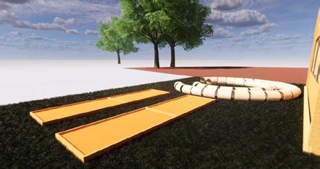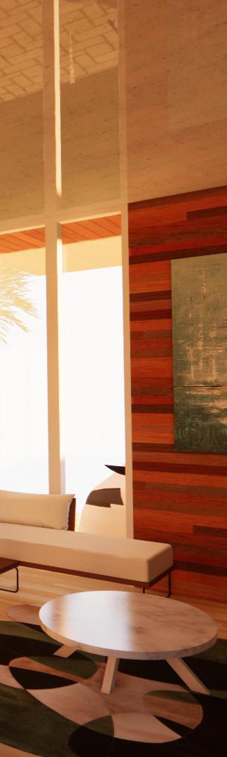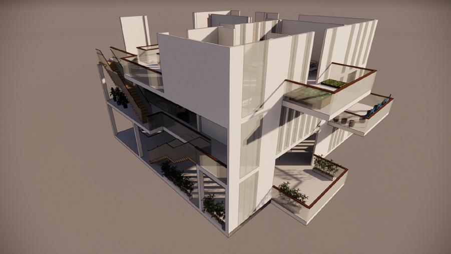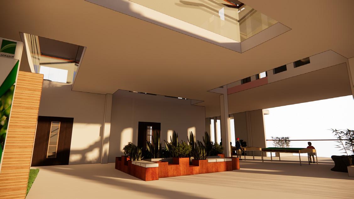gain, the building openings are path. Windows are also added on order to avoid the sun and reBy reducing solar transmitreflective glazing on the clerereducing the long-wave solar radiaoutside to the inside. Green walls space to provide shading and are placed mainly in the north, natural ventilation. The idea is to system that allows wind/air to flow structure. The placement of the louprovide cross and stack ventilacontrol the flow of air and provide energy in the structure.