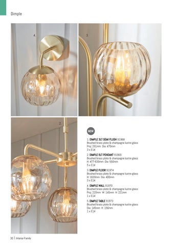 1. DIMPLE 3LT SEMI FLUSH 91968 Brushed brass plate & champagne lustre glass Proj: 291mm Dia: 470mm 3 x E14 2. DIMPLE 5LT PENDANT 91969 Brushed brass plate & champagne lustre glass H: 477-630mm Dia: 550mm 5 x E14 3. DIMPLE FLOOR 91974 Brushed brass plate & champagne lustre glass H: 1620mm Dia: 400mm 3 x E14 4. DIMPLE WALL 91970 Brushed brass plate & champagne lustre glass Proj: 220mm W: 145mm H: 221mm 1 x E14 5. DIMPLE TABLE 91973 Brushed brass plate & champagne lustre glass Dia: 145mm H: 156mm 1 x E14