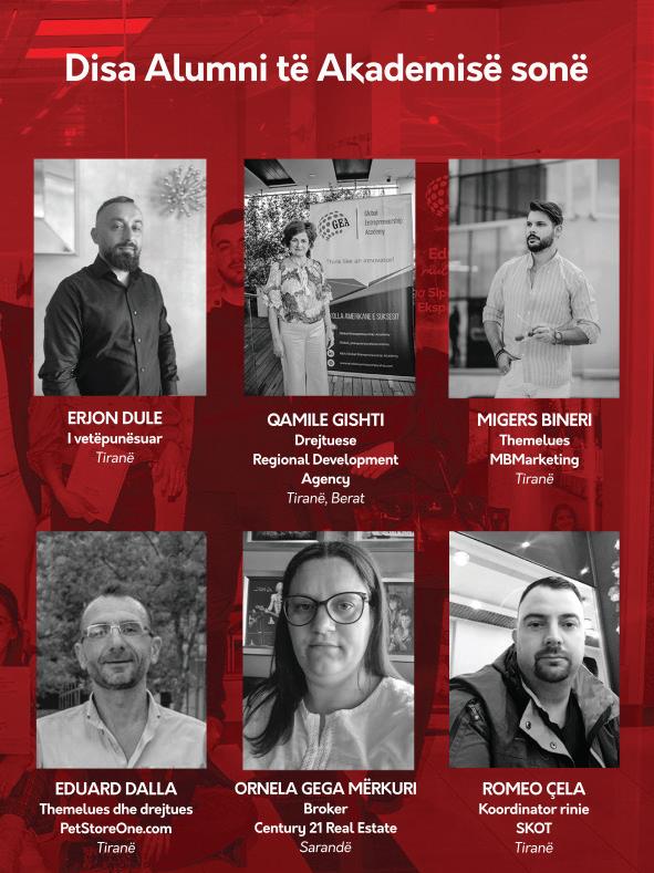 Disa mendime për nenga studentët & trajnerët “Menaxhimi i gjendjes psikologjike, theksimi i një pakete aftësish dhe zhvillimi i ndërgjegjësimit janë faktorë të rëndësishëm që do të përvetësoni në këtë akademi dhe do t’ju vlejnë për rrugën drejt sukesit.” AVINASH ANANDA, trajner i modulit të lidershipit, bashkëthemelues i Meta Mind Management “Eksperienca multidimensionale në akademinë GEA ishte e domosdoshme & e pazëvendësueshme: profesionalizmi, energjia pozitive & bashkëpunimi janë ato që gjeta më së miri; një ndërthurje e përkryer mes teorisë, praktikës, këshillave & motivimit, një kombinim shumë i vështirë për t’u gjetur sot, kur çdo gjë është kthyer në biznes.” SANTILIANA MUHO, studente, drejtuese e Santi & Partners “Trajnimet në akademinë GEA ishin si çelësi i ndriçimit të kështjellës së sipërmarrjes sime. Veçanërisht në periudhën e vështirë të karantinës, të gjitha modulet së bashku u kthyen në ‘dritën në fund të tynelit’ të sfidave të biznesit tim. Faleminderit GEA!” VIKTORI THOMOLLARI, studente, administratore e agjencisë imobiliare “Tore Berat” “Elementë të rëndësishëm të eksperiencës ndërkombëtare 170 vjeçare të PwC do të jenë pjesë e kurrikulës së akademisë GEA.” LORETA PECI, Country Managing Partner, PwC Albania and Kosovo