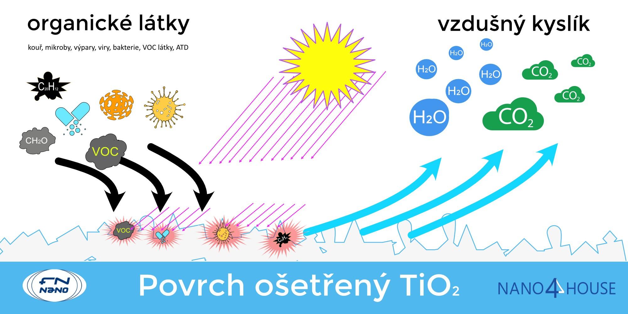 Fotokatalýza na TiO2 účinně rozkládá prakticky všechny organické látky na základní minerální oxidy tím, že spouští a urychluje jejich oxidační proces.