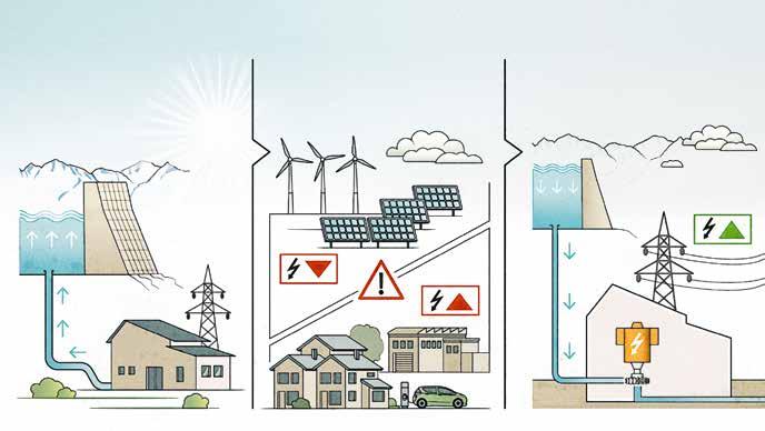 In solchen und ähnlichen Situationen kann die Wasserkraft eine mögliche Lösung bieten. Sogenannte Pumpspeicherkraftwerke lassen sich schnell und flexibel einschalten, um überschüssigen Strom sinnvoll zu nutzen und das Netz zu stabilisieren. Der Strom wird eingesetzt, um Wasser von einem tiefer gelegenen Becken in ein höher gelegenes zu transportieren. Von dort aus fliesst es zu einem späteren Zeitpunkt wieder durch eine Turbine nach unten und pro-