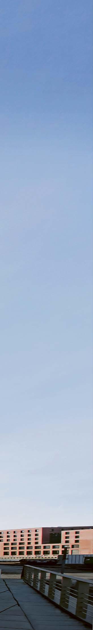 While the white-glazed spruce timber that was used as a load-bearing element adds a lot of warmth to the building, the core structures for the stairwells and elevators, made of reinforced concrete, offer an exciting contrast. The front façades of the building are made of glass, providing a view of the goings-on in Münster’s harbor. Green glazed tiles on the façade perfectly match the timber, lending an architectural accent to the building’s ecological theme. By replacing and supplementing concrete and steel with timber, CO₂ emissions in the production stage alone could be reduced by 1.1 tons per cubic meter of lumber. In addition, every cubic meter of timber stores a further 0.9 tons of CO₂. The use of wood therefore saved around 260 metric tons of CO₂ compared to a conventional reinforced concrete building. Other energy efficiency measures in H7 include the use of the existing district heating network, a highquality seals used for the building envelope, a natural ventilation concept, and the use of LED technology in the lighting. In addition, charging stations are provided for electric cars and e-bikes. Not only con -