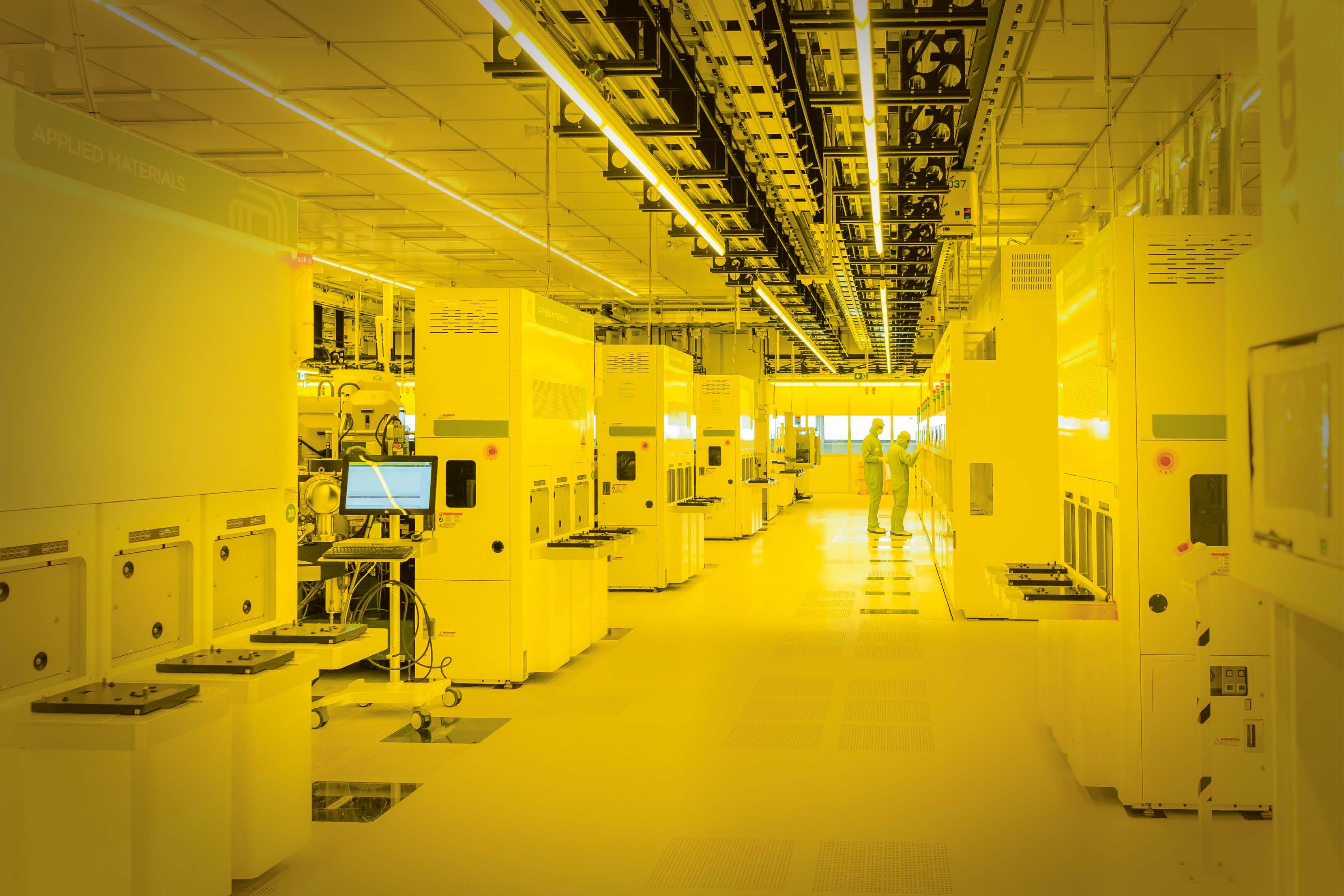 The clean room lighting emits a special yellow light that contains no UV rays.