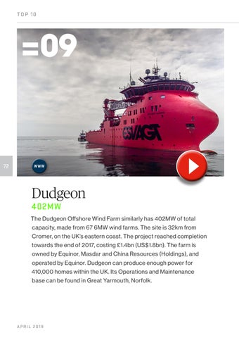 Dudgeon 402MW The Dudgeon Offshore Wind Farm similarly has 402MW of total capacity, made from 67 6MW wind farms. The site is 32km from Cromer, on the UK’s eastern coast. The project reached completion towards the end of 2017, costing £1.4bn (US$1.8bn). The farm is owned by Equinor, Masdar and China Resources (Holdings), and operated by Equinor. Dudgeon can produce enough power for 410,000 homes within the UK. Its Operations and Maintenance base can be found in Great Yarmouth, Norfolk.