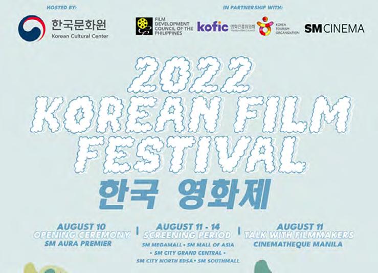 □ 해외문화홍보원(원장 박명순) 주필 리핀한국문화원(원장 임영아)이 오는 8 월 11일부터 14일까지 메트로 마닐라 전역 5개 극장에서 ‘2022 한국 영화 제(2022 Korean Film Festival)’를 개최한다. ○ 주필리핀한국문화원의 주요 연간 행사인 한국 영화제는 지난 2020년 3 월 코로나 발병 이후 2년 간 온라인으 로 개최되었다. ○ 올해는 메트로 마닐라 전역에 위치 한 5개의 극장에서 총 7편의 영화를 상 영할 예정이다. 영화는 상영기간동안