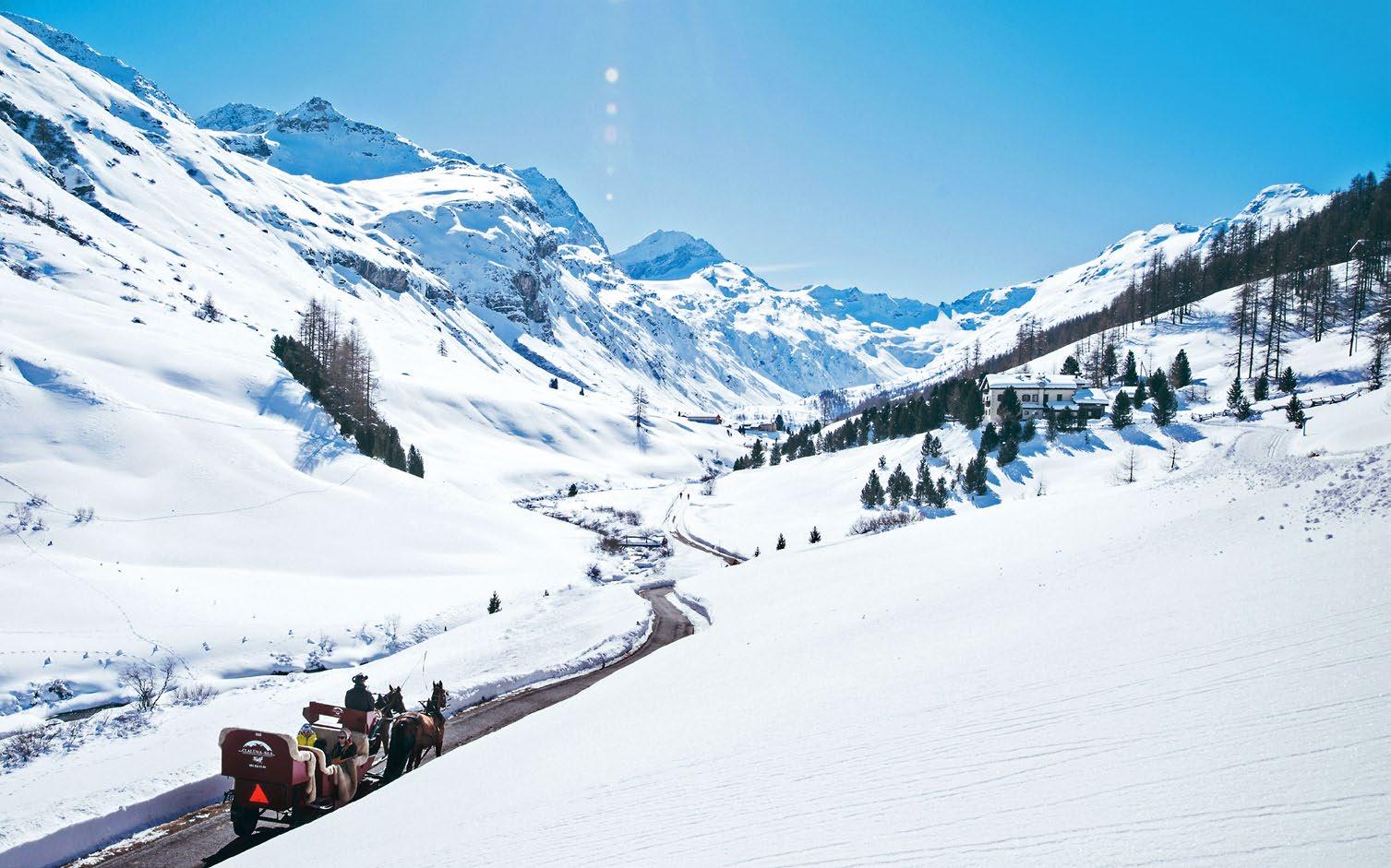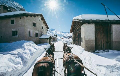 Eine Kutschenfahrt gilt zu Recht als Sinnbild der Entschleunigung. Vom Dorfplatz in Sils fahren Zweispänner nach Platta, Crasta und ganz hinauf zum Hotel Fex. Eingepackt in warme Decken können die Fahrgäste die Fahrt durch den Wald oberhalb von Sils und dann die verschneiten Ebenen des malerischen Seitentals geniessen.