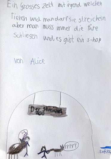 Ein grosses Zelt für einen Streichelzoo mit vielen Tieren wünscht sich Alice aus St. Moritz. Am liebsten würde sie es auf der Zirkuswiese am See aufstellen. Es sei sehr schade, dass der Zirkus Nock nicht mehr dort gastiere, sagt Alice. Ihr Lieblingstier ist der Elefant, weil er so härzig ist. Alice ist die Schwester von Leon.