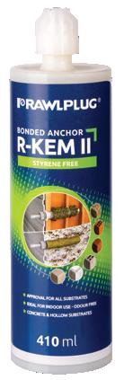 28 WWW.CONSTRUCTIONSUPPLY.COM.AU R-HPTII-A4 Stainless steel throughbolt for cracked and non-cracked concrete R-HPTII-ZF Zinc flake throughbolt for cracked and non-cracked concrete R-XPTII-A4 Stainless steel throughbolt for non-cracked concrete R-XPTIII-HD Hot Dip Galvanized Throughbolt fo THROUGHBOLTS NEW • Efficiency in the most demanding environments • Working life up to 100 years • Unique Cut-Free Cartridge Design • ETA Approvals • Manufactured in Europe R-KEM-II-300 RA1002 Styrene free polyester resin the most universal polyester resin for concrete and masonry substratessolid and hollow ETA-21/0243 • ETA-12/0394 ETA-12/0528 R-KEM-II-410 RA1003 Styrene free polyester resin the most universal polyester resin for concrete and masonry substrates - solid and hollow ETA-21/0243 • ETA-12/0394 ETA-12/0528 R-KER-II-400 RA1013 Hybrid resin a versatile hybrid resin for high loads in cracked and uncracked concrete ETA-21/0242 • ETA-17/0594 ETA-17/0874 R-KEX-II-600 RA1019 Pure epoxy resin the strongest epoxy resin, regardless of the ambient temperature and concrete retains high strength ETA-21/0244 • ETA-13/0455 ETA-13/0585 R-LX HEX Screw Bolt Zinc Flake Galvanised *Se smic per formance categories C1 and C2: M8, M10 and M14 R-FF1-N Nylon frame fixing for use in all base material Screws made of stainless steel, with anti-corrosion coating or zinc plated ETA-12/0398 • The stainless steel screw for best anti-corrosion protection and external applications • The countersunk plug for flush fixing of soft material (eg. timber) • Specially-formulated nylon allows best performance installation for use in all base material categories according to ETAG 020 (A, B, C, D) R-FF1-N 10 X 100 MM Frame Fixing With Hex Head Screw, Zinc Plate R-LX Concrete Screw Anchor self-tapping concrete screwbolt for cracked and non-cracked concrete RA1002 $19.80 RA1003 $24.95 RA1013 $44.00 RA1019 $59.95 RA7103 M10 x 85mm $165.00/100 RA7122 M12 x 100mm $246.00/100 RB8600 M10 x 100mm $143.00/100