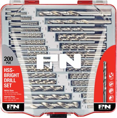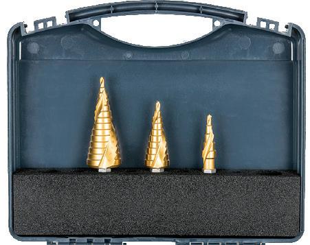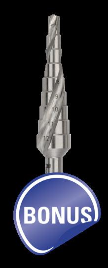 Cutting Lubricants • Reduces torque and friction • Extends tool life • Improves surface finish Blue Bullet Drill Sets The blue finish reduces chip build up on the cutting edge and is a better choice when drilling ferrous materials. HSS Step Drills For use in sheet metal, aluminium, plastic and fibreglass. During drilling, the next step deburrs the previously drilled hole. 10 Pce Bolt Extractor Insert Set M604 0817 • 8, 9, 10, 11 & 12mm inserts: suits 14mm wrench • 13, 14, 15, 16 & 17mm inserts: suits 19mm wrench 25 Pce HSSCobalt Drill Set + BONUS Countersink 149060006 • Metric Drills: 2-13mm • Countersink: 16.5mm