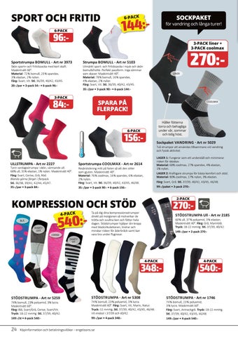 74 % bomull, 23 % polyamid, 3 % lycra. Maskintvätt 60°. Färg: Svart, Vit, Marin, Natur. Tryck: 12 mmHg. Stl. 37/39, 40/42, 43/45, 46/48. Vit endast i 37/39 och 40/42. 99:-/par • 4-pack 348:-