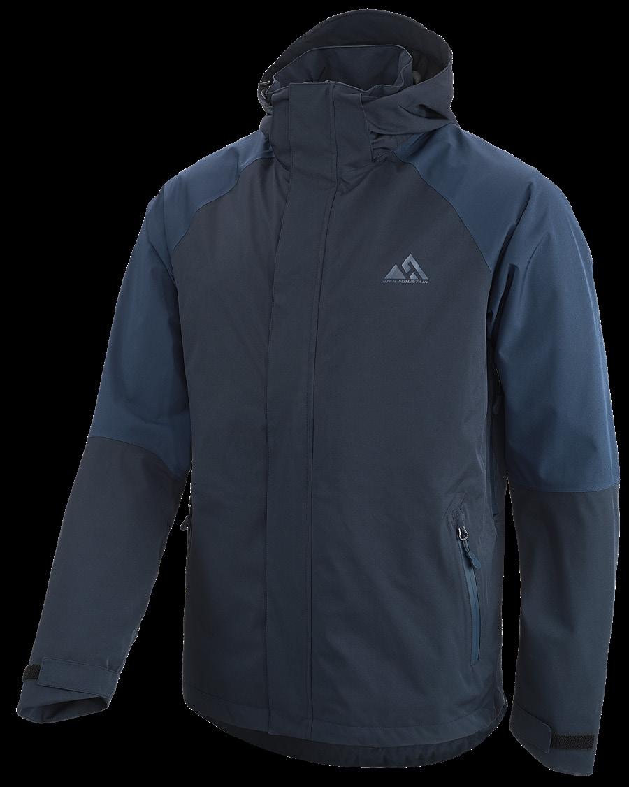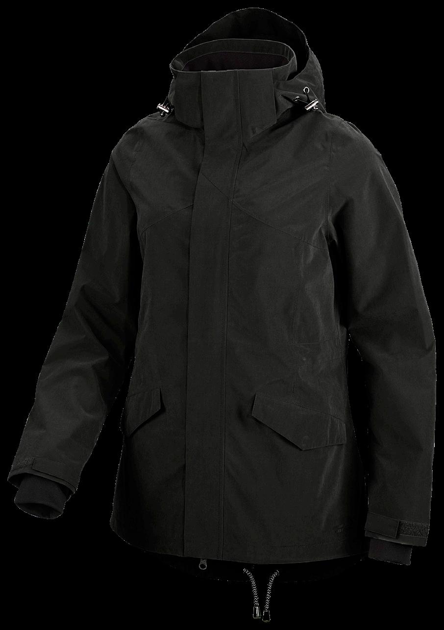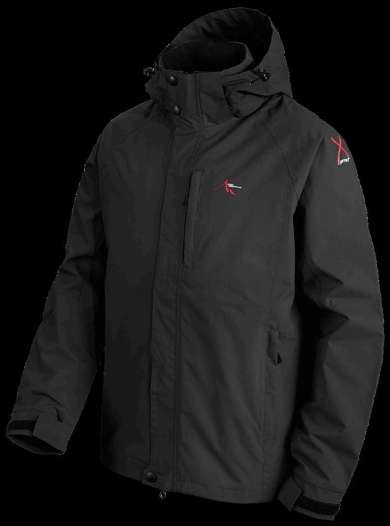 High-Tex-membran med andasfunktion 6000 g/m²/24h. Avtagbar huva samt ställbar vidd i ärmslut och nederkant. Kraftig tvåvägsdragkedja samt sidfickor, bröstficka och innerficka med dragkedja. Yttertyg 95% polyester, 5% elastan. Foder 100% polyester.