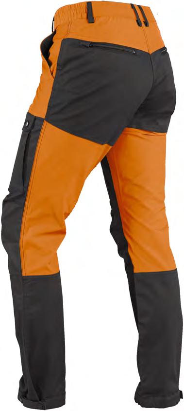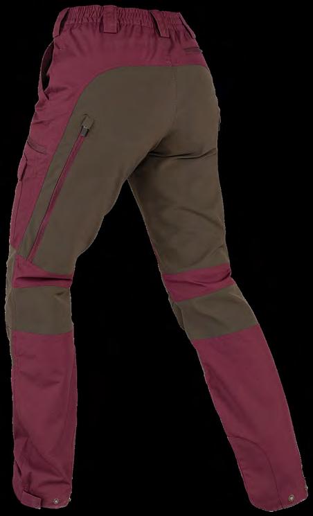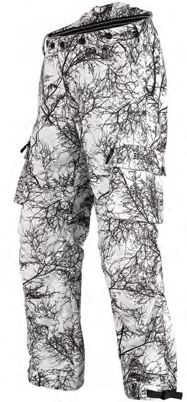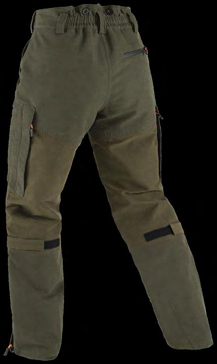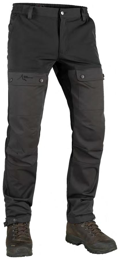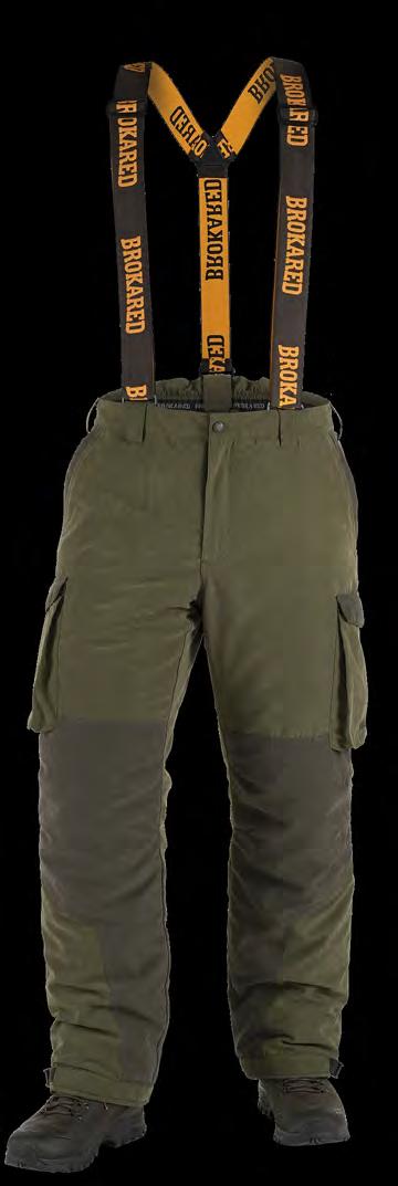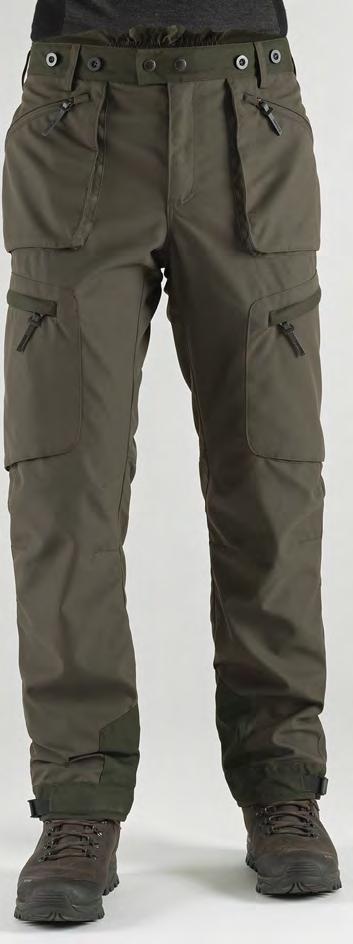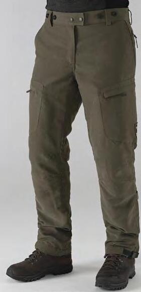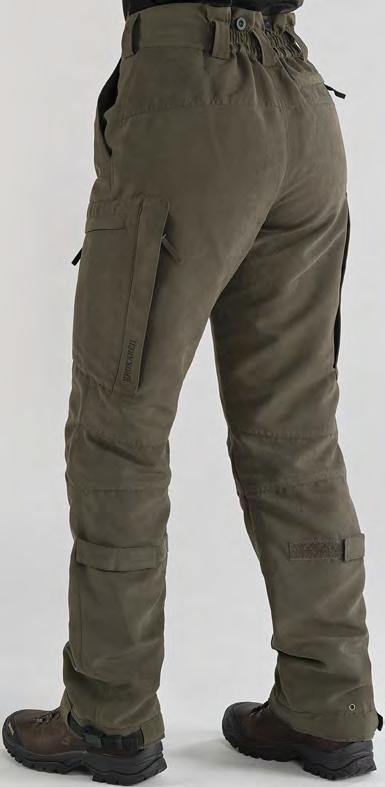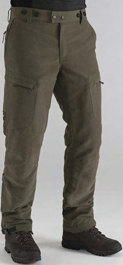 Förhöjd rygg med resår. Ventilation med dragkedja och mesh på baksidan av låren. Praktisk antiglidremsa håller tröjan/skjortan på plats. Rymliga framfickor, bakficka samt rymliga benfickor med bälg och dragkedjor. Praktisk patronhållare i den vänstra benfickan. Förböjda knän med kardborre som justerar knävidden. Justerbara benslut med snabbspännen. Knappar för hängslen.