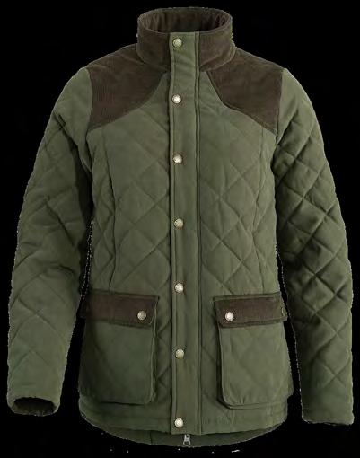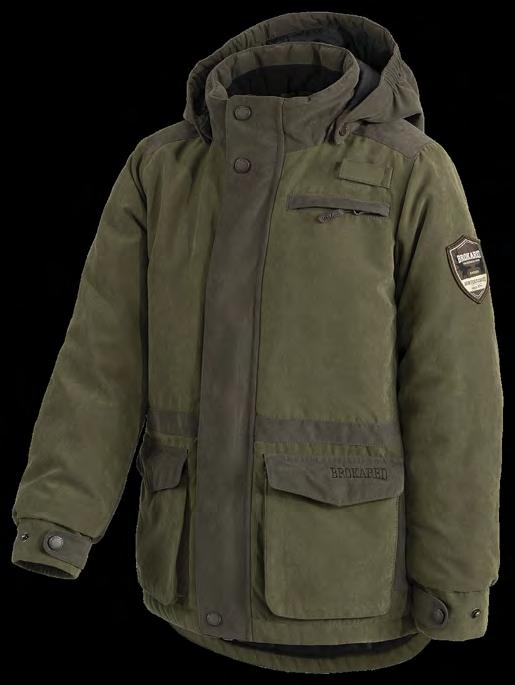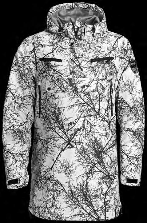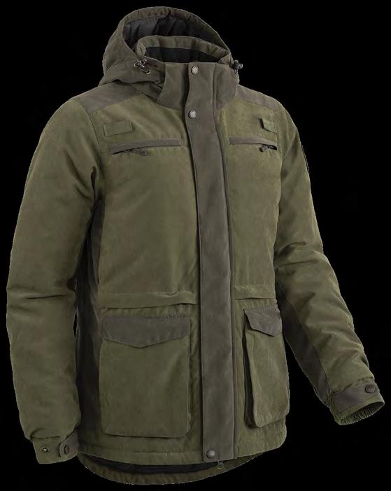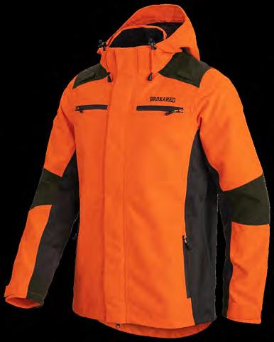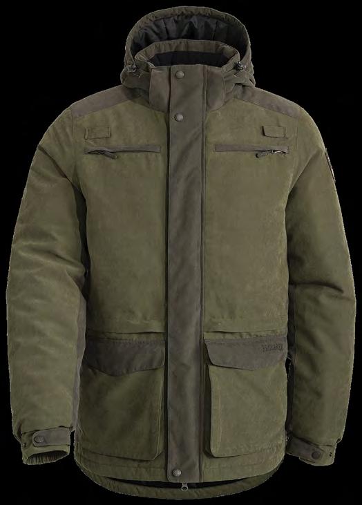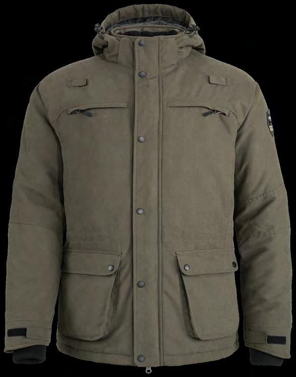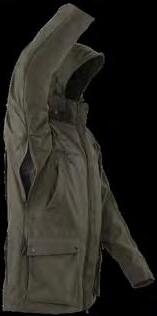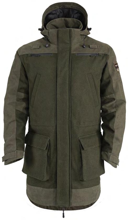 Fast ställbar huva, radiofickor som stängs utåt samt antennlås. Bröstfickor, rymliga framfickor med lock och tryckknapp med patronhållare samt genomgående ryggficka med dragkedjor. Längre baktill. Kraftig tvåvägsdragkedja. Ställbar nederkant och ärmslut.