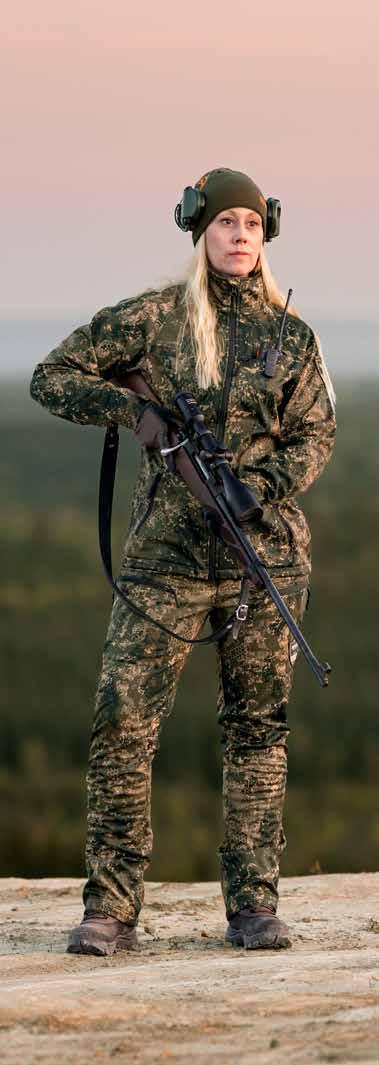 Lätt, smidigt och tyst kvalitetsställ i mjuk, flossad microfiber med meshfoder på insidan. Perfekt för den rörlige jägaren. Membranet har en vattenpelare på 15 000 mm och andas 8000 g/m²/24h. Setet har inbyggd Recco®-reflektor som gör det lättare för räddningsteam att snabbare lokalisera dig om du gått vilse eller skadats i naturen. Yttertyg A: 100% polyester. Foder A: 100% återvunnet polyester. Foder B: 100% polyester.