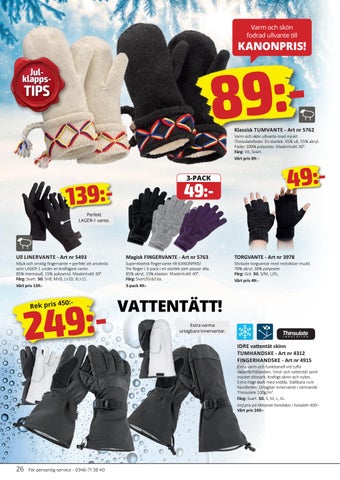 Varm och skön ullvante med mjukt Thinsulatefoder. En storlek. 45% ull, 55% akryl. Foder 100% polyester. Maskintvätt 30°. Färg: Vit, Svart. Vårt pris 89: -