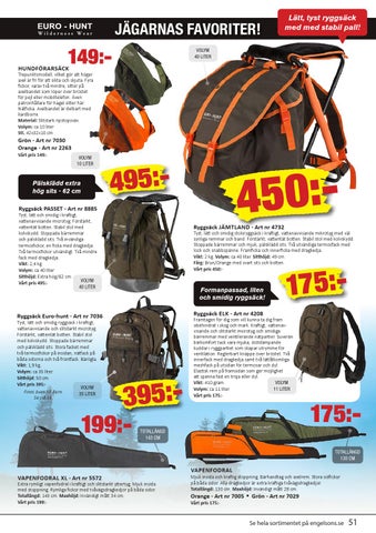 Ryggsäck Euro-hunt - Art nr 7036 Tyst, lätt och smidig ryggsäck i kraftigt, vattenavvisande och slitstarkt microtyg. Förstärkt, vattentät botten. Stabil stol med kolvskydd. Stoppade bärremmar och pälsklädd sits. Stora facket med två termosfickor på insidan, nätfack på båda sidorna och två frontfack. Bärögla. Vikt: 1,9 kg. Volym: ca 35 liter. Sitthöjd: 50 cm Vårt pris 395:Volym Finns även till Barn. 35 liter Se sid 33.