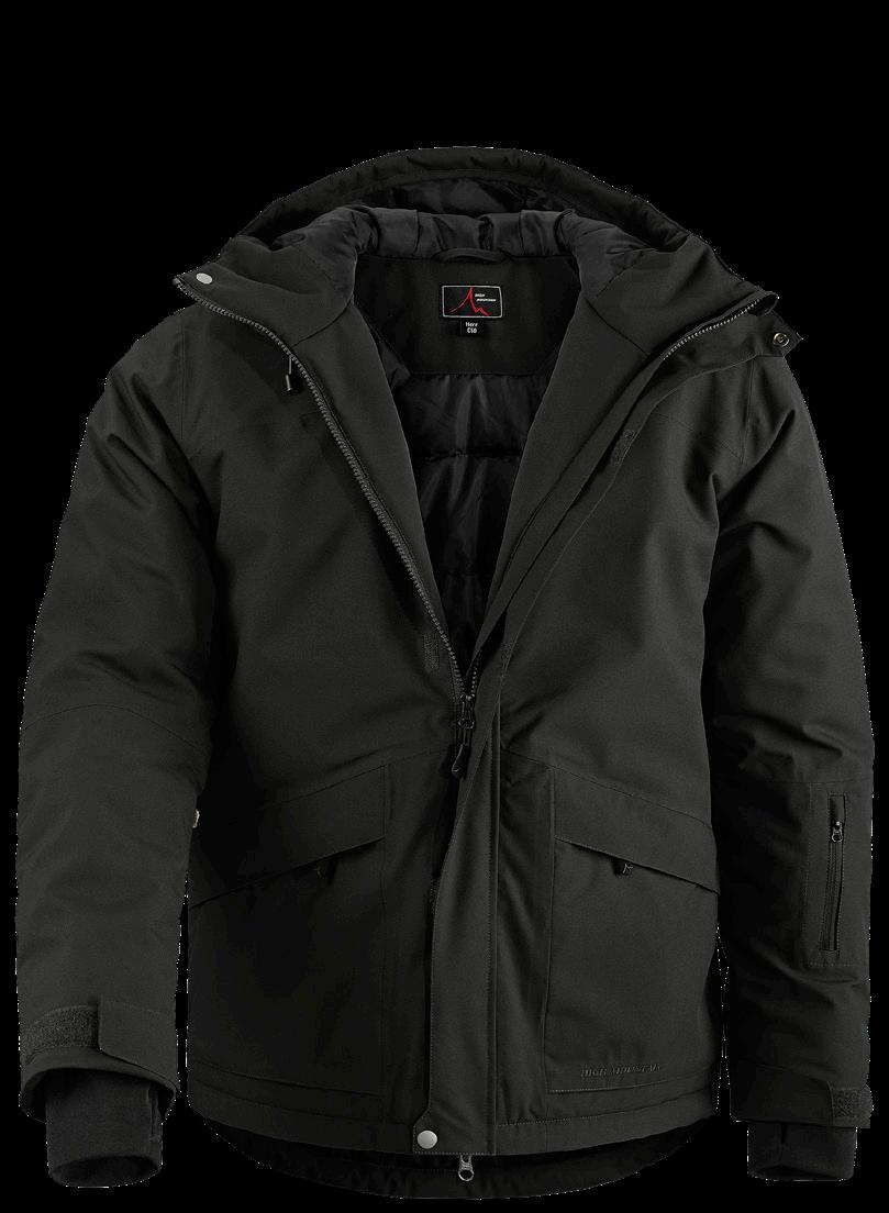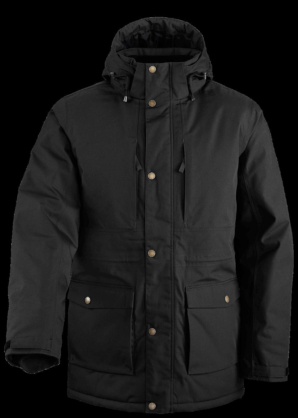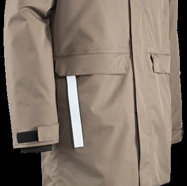 Varmfodrad och vattentät med andasfunktion. Membranet har en vattenpelare på 8000 mm och andas 5000 g/m²/24h. Samtliga sömmar är tejpade. Avtagbar, reglerbar huva. Dragsko i midja och nederkant. Kraftig tvåvägsdragkedja. Resårmuddar i de justerbara ärmsluten. Öppna sidfickor, framfickor med lock, dolda bröstfickor, innerficka med dragkedja. Integrerat reflexband i högra fickan som hängs ut vid behov. Dammodellen är något insvängd i midjan. Yttertyg 65% polyester, 35% bomull. Fyllning 100% polyester.