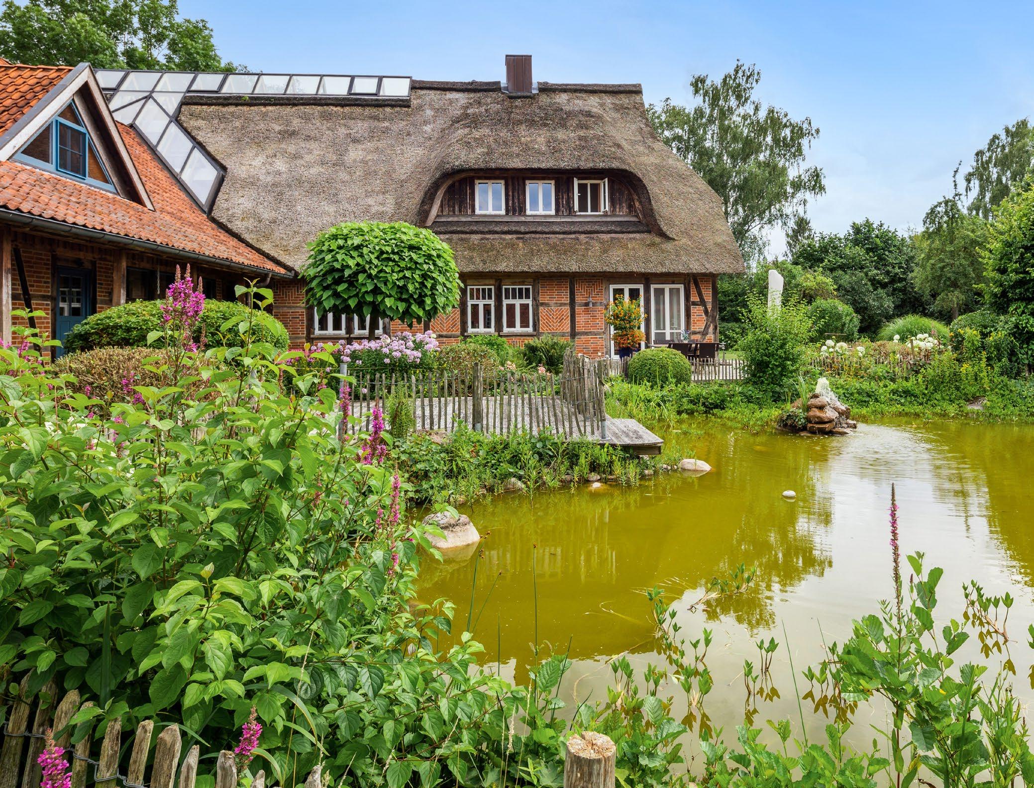 Dieses außergewöhnliche Anwesen vereint Geschichte und Moderne in einem einzigartigen Ensemble. Das reetgedeckte ehemalige Bauernhaus von ca. 1783 wurde 2000 vollständig demontiert und nach traditioneller Handwerkskunst wiederaufgebaut. Gekonnt kombiniert mit modernem Design und großzügigen Glasflächen bietet diese Rarität exklusiven Wohnraum in traditioneller Architektur mit separatem Gästebereich. Teich und Obstbäume verleihen dem Garten besondere Idylle – die Weideflächen sind ideal für Pferdeliebhaber.