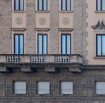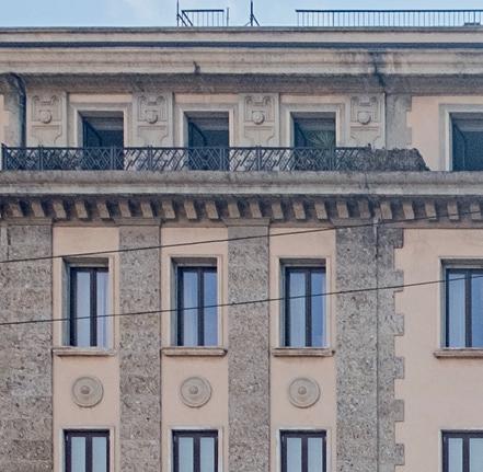 architetti. Il palazzo in marmo bianco sobrio e leggero presenta linee pure e razionaliste, mentre la torre in mattoni presenta linee più dinamiche grazie alla presenza di ampi bow window e terrazze a gradoni. L’edificio è stato anche uno dei primi grattacieli di Milano nel 1935. Entrambi gli edifici riflettono la visione di integrare design innovativo e tradizione, creando spazi che siano al tempo stesso moderni, raffinati e abitabili.
