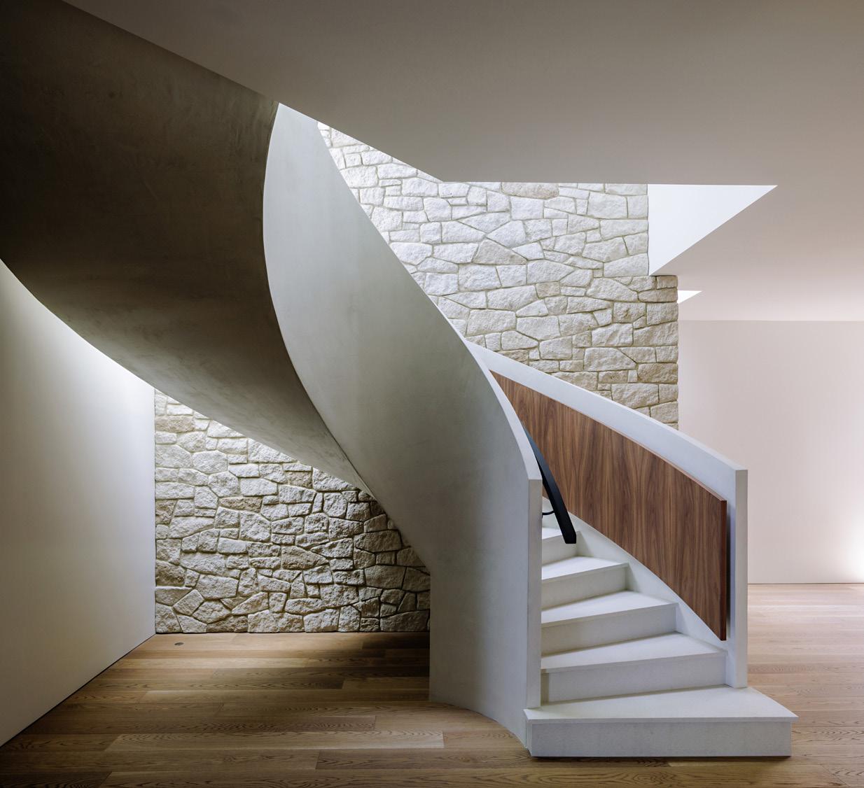 • Bordered with 2 atrium spaces up to main level, harmonized with outdoor finish and raw rock edge