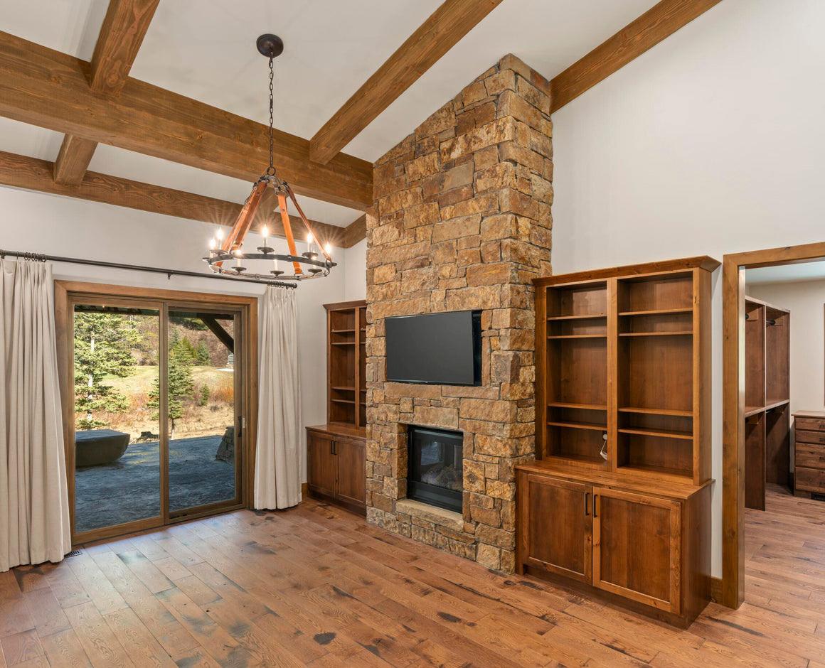The primary suite features a jetted tub, fireplace and walk-in closet. Ample storage is provided throughout the home with custom built-ins.