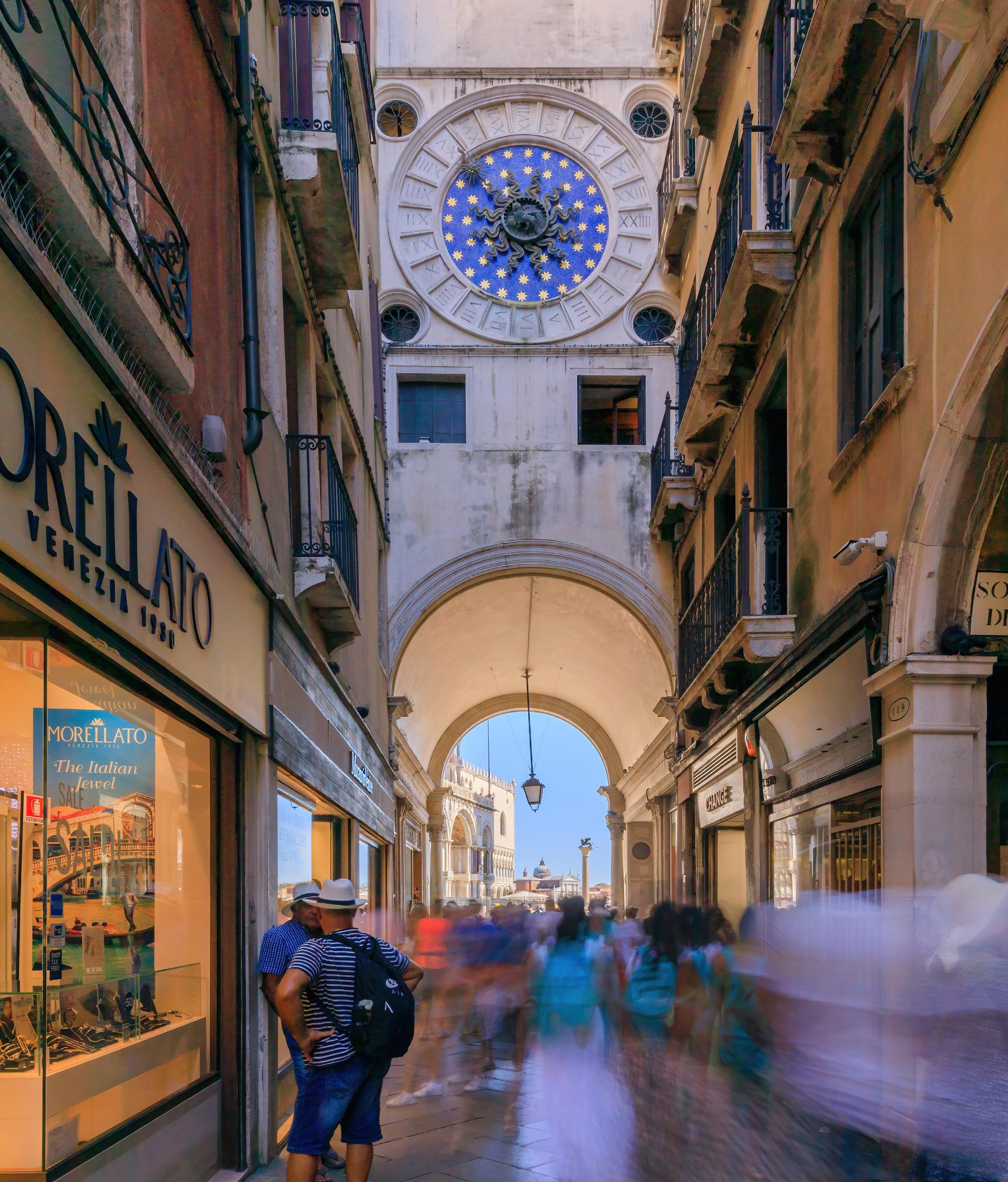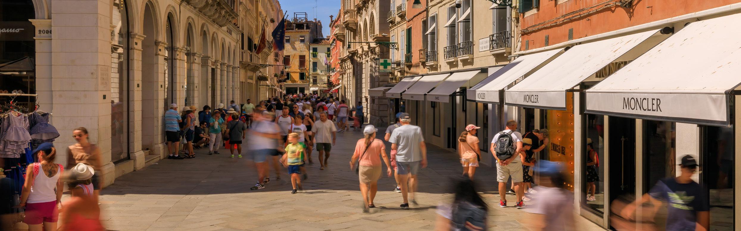 Venezia si colloca al secondo posto (preceduta solo da Firenze) tra le 50 destinazioni mondiali più adatte al turismo a piedi* - in virtù del fatto che le attrazioni principali sono tutte molto vicine tra loro. La sua conformazione unica al mondo, infatti, basata quasi esclusivamente su flussi pedonali, consente alla città di essere vissuta dal punto di vista commerciale come un unico grande polo commerciale, in cui ogni “calle” accoglie un susseguirsi di negozi e vetrine che ospitano svariate categorie merceologiche. Nelle prossime pagine analizzeremo nel dettaglio le vie principali dello Shopping, le cosiddette “High Streets”, ovvero i percorsi con la presenza maggiore di attività commerciali e con i “Footfall” più intensi: