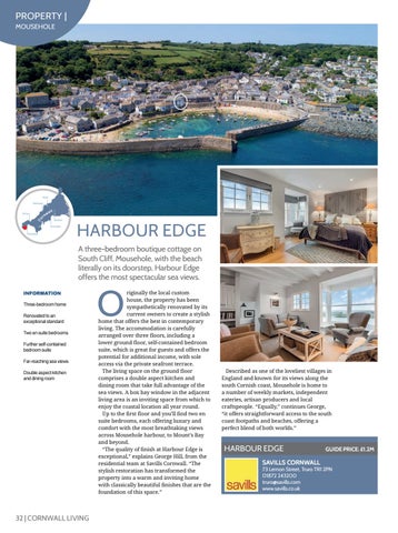 riginally the local custom house, the property has been sympathetically renovated by its current owners to create a stylish home that offers the best in contemporary living. The accommodation is carefully arranged over three oors, including a lower ground oor, self contained bedroom suite, which is great for guests and offers the potential for additional income, with sole access via the private seafront terrace. The living space on the ground oor comprises a double aspect kitchen and dining room that take full advantage of the sea views. A box bay window in the adjacent living area is an inviting space from which to enjoy the coastal location all year round. p to the first oor and you’ll find two en suite bedrooms, each offering luxury and comfort with the most breathtaking views across ousehole harbour, to ount’s ay and beyond. The uality of finish at arbour dge is e ceptional, e plains eorge ill, from the residential team at Savills Cornwall. “The stylish restoration has transformed the property into a warm and inviting home with classically beautiful finishes that are the foundation of this space.”