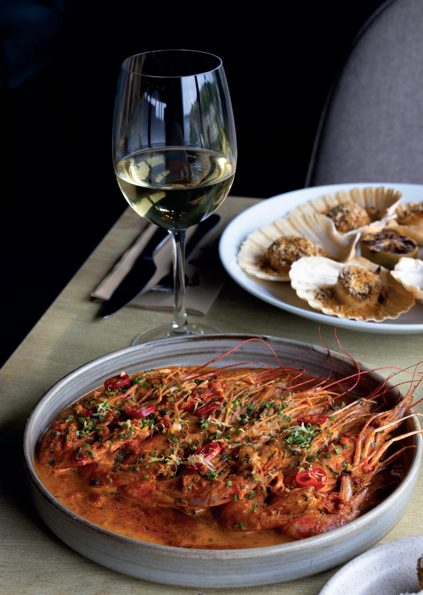 Top down and still basking in the coastal air, our next stop is Swanpool Beach’s very own gem, Hooked on the Rocks (hookedontherocksfalmouth. com). Specialising in seafood such as Falmouth Bay scallops with roe butter and seaweed pangrattato, and wild prawns with garlic butter, ‘nduja, lime and fresh herbs, this location will