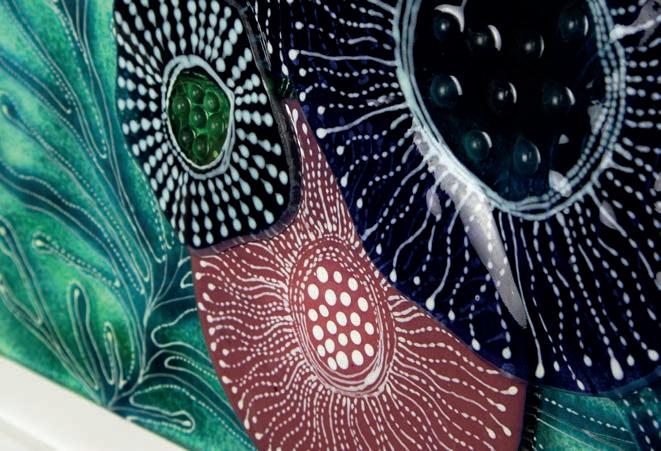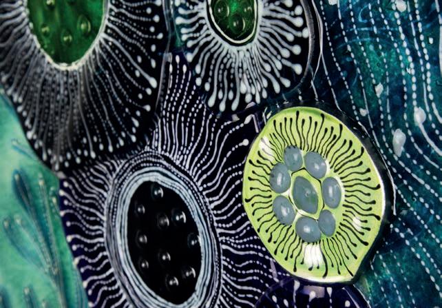 The work that arose from this solitude was unlike anything she had created before. Some pieces sold before they could even be photographed, demonstrating their energy and originality. This became the foundation of her latest Signature Collection, which marks a leap in complexity. Drawing directly onto glass with a needle-tipped pen filled with specially mixed enamels, Jo forms lines that blur and bleed during firing, much like watercolour pigments seeping into paper. This organic unpredictability reflects the Cornish coastline, one of her lasting inspirations, with its constant interplay of solidity and erosion. These are not works that can be rushed. Each piece takes days, with multiple processes layered together, elements fired separately and then assembled into richly textured compositions. Some surfaces are smooth and sinuous, others jagged, their edges a reminder of the sharpness that has left Jo’s hands permanently scarred. She jokes that her expertise could be measured in cuts rather than hours, but the truth is she has long surpassed the 10,000-hour threshold for mastery.