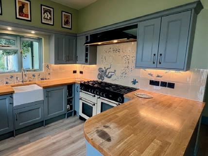 Step into this first-floor apartment and be welcomed into the stunning open-plan sitting, dining and kitchen area. The sitting area is oh-so-inviting with a large teal blue corner sofa, characterful armchair and television. There is also underfloor heating throughout and a selection of books, games and DVDs to enjoy. The kitchen is equipped with an electric oven, ceramic induction hob, microwave, fridge/freezer, wine fridge and more. Special moments ignite around the large dining table, which seats up to eight, while the breakfast bar offers a more relaxed setting for leisurely meals.