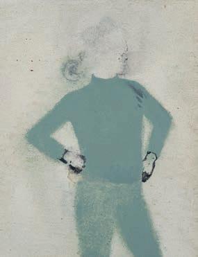 rears thrives on arms, however, especially when sheathed in sleeves. That means the hands can stay, too. But that is not a firm rule. There are no firm rules I see no reason to be consistent… nor to explain myself. This approach accounts for the eeting uality of the work. The only solid element seems to be the strong colour the figure is placed against. As you look, you begin to wonder if the person is meant to be in the painting at all. And that thought creates a striking sense of anticipation, a sensation not o en found in an image. Instead it is an essential feature of storytelling. But who is telling the story