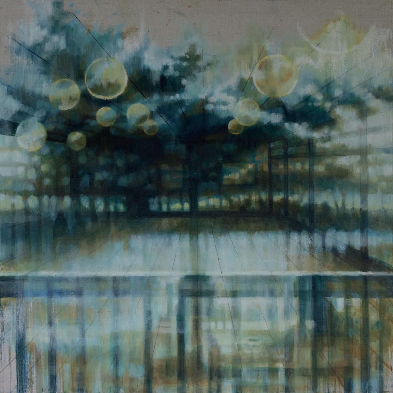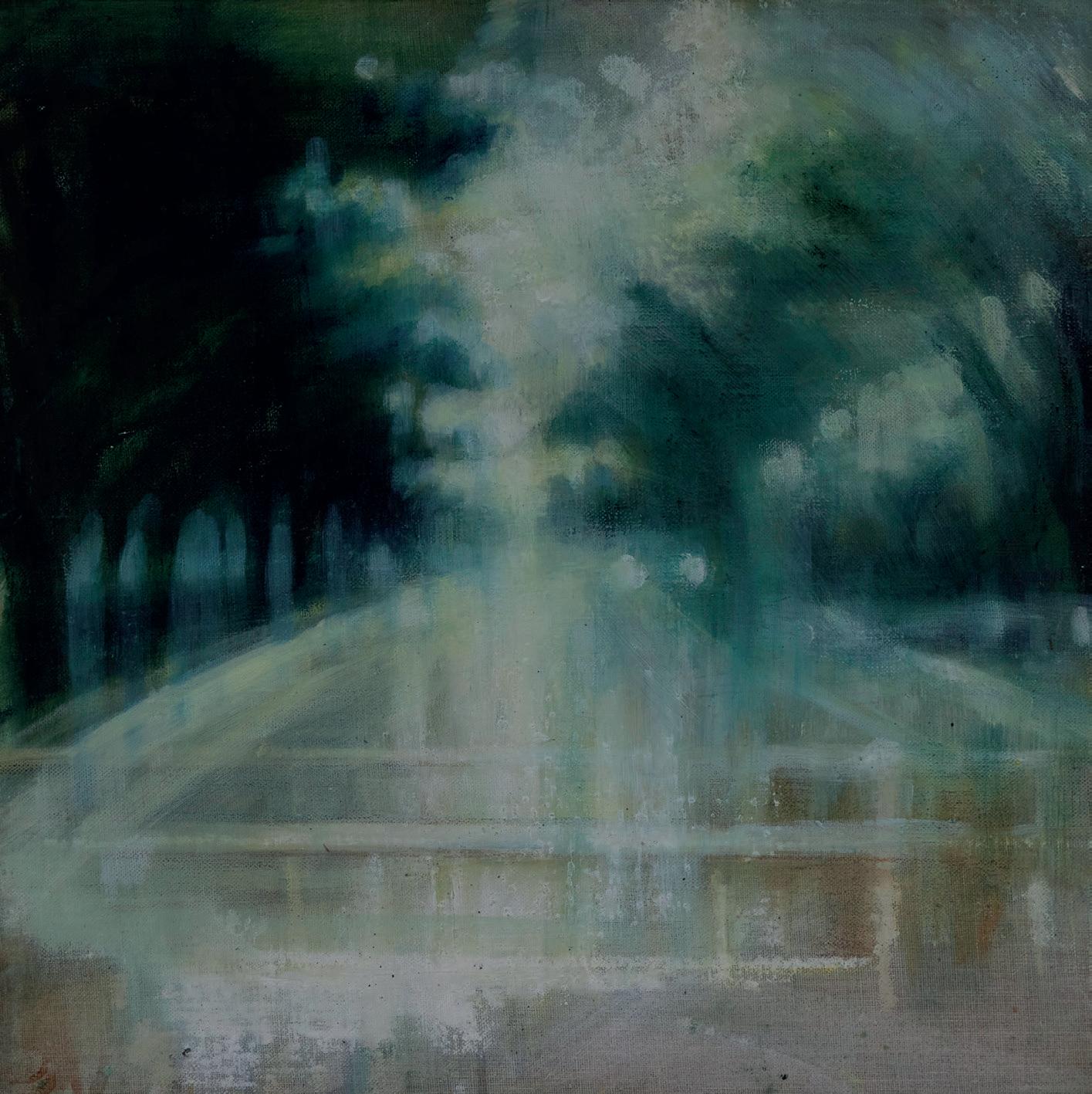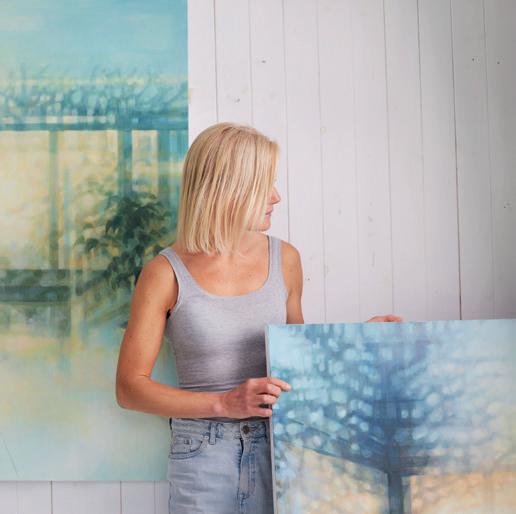 intrusive I drew them in the reflection of the train window, and I started to notice the wonderful layers and contrasts created on the glass as the landscape rushed past over the faces of figures lost in thought. This developed into looking at café windows, with their wonderful layers of interior and exterior worlds, all colliding into one dreamlike image on the glass surface. I never get bored of this ever-changing reflective picture, and I often paint the same window over and over as the seasons and the light change. Even within just one day a reflection will completely transform with the rising and setting of the sun.”