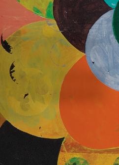 The effect is curiously urban and inexpressive, like a street billboard. Motifs can be repeated exactly and layered on top of a ground textured with a combative, abraded quality, like a wall exposed to wear and the sun that passers-by might scrape or write on. Space is reduced to a single integrated zone within which exuberance abounds in colour and line. Which is on top is indistinguishable from what lies beneath. Yet, as with any long-lasting structure, nothing is random. Apparent, too, is a high level of order, a fusion she paraphrases as “geometry overlaid by imagination”.