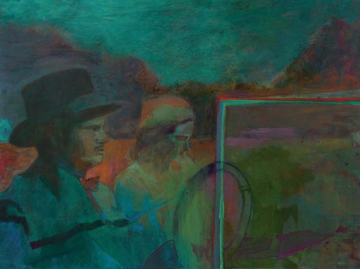 colour flattens the image into a kind of photo negative, a cats-eye of shifting visual information. The haze of colour in each work adds greatly to its ambiguity and allure. I consider this in the context of Laid Back on The Brink, a Gauguin style surfmovie scene that draws my eye amongst the cowboys, circus acts and period drama detailing of her other works. The more I look, the more immersed I become. “I like to play around with colour and shape in an abstracted way,” says Belinda, “especially with my pastel works, so that it draws your eye but doesn’t necessarily link to the image. I use colour to guide a viewer into and around the work. It’s a real battle when I am painting, to be abstract and not figurative with colour, and to emphasise