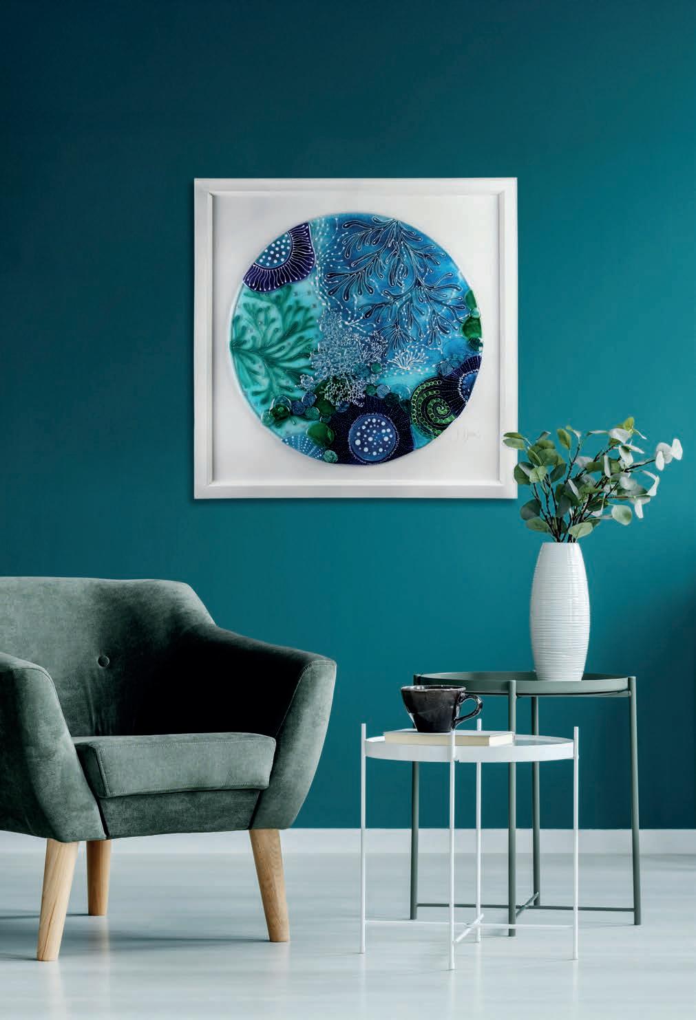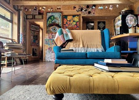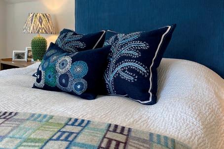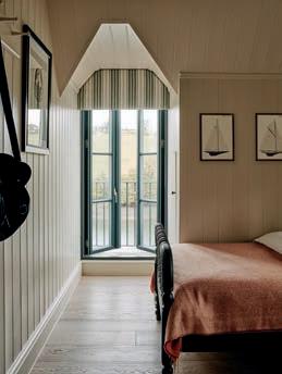 Heron Creek, a reverent reimagining of an Arts and Cra s home once commissioned by the Bird’s Custard family, is a lesson in subtle storytelling. Eschewing seaside clichés, the design team, led by founder Cathryn and senior designer Lynne, focused on texture and timelessness. Nautical charts, blownback tree illustrations by North Cornwall artist Nicole Heidaripour and a metal wall sculpture harmonise with hand finished local oinery and velvet upholstered classics. The house retains its historic soul while nodding to its waterside setting, without being obviously ‘coastal’.