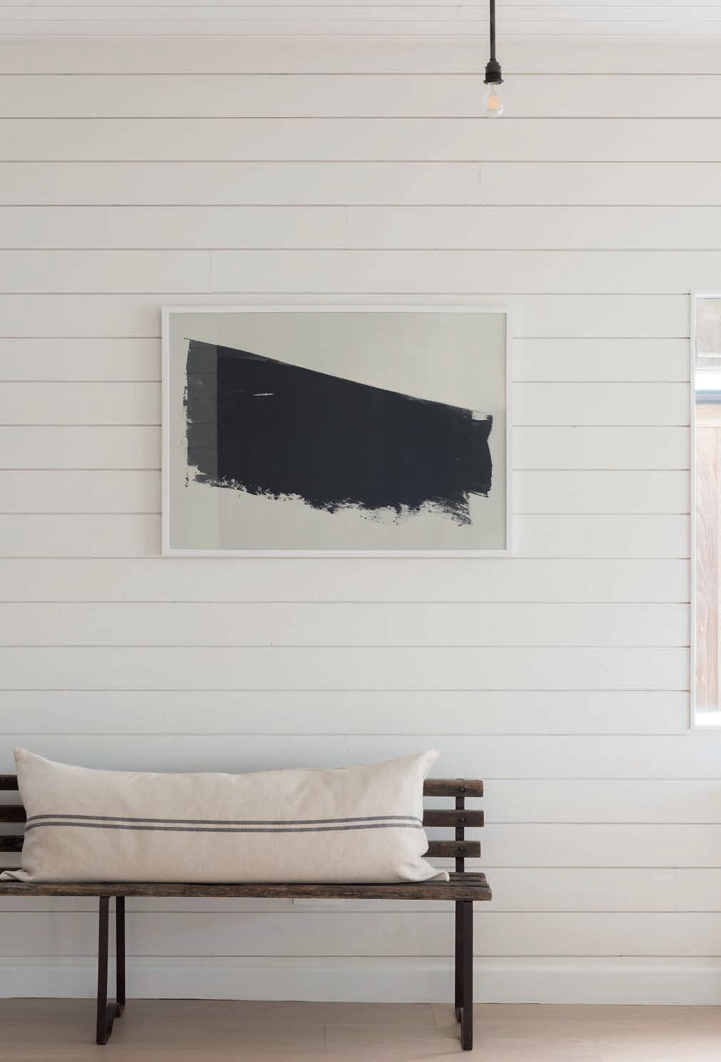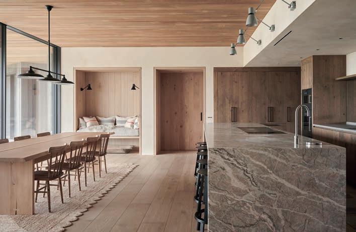 playful sense of fun also runs throughout adding to the informality of the house, with pops of colour, bespoke millwork, striped patterned tiling and plentiful so seating and vintage pieces. ockets of custom oinery create moments such as the oating daybed window seat looking out over the beach, a reading nook in the kitchen and alcove shelving in each room to store found beach treasures, games and books. Every inch of the interior invites you to sit play relax and ust en oy the home and its beautiful locality yet with a sense of relaxed luxury.