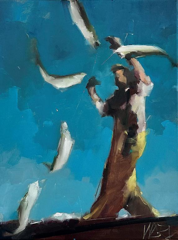 even invasive Mediterranean octopus – rendered directly from the fish themselves in iridescent acrylics, printed onto fine paper and eaten not long after. Her work reimagines Gyotaku, an 18th-century Japanese method of recording a catch before supper, stripping it of nostalgic reverence and placing it in a contemporary realm with fine and broad black line work.
