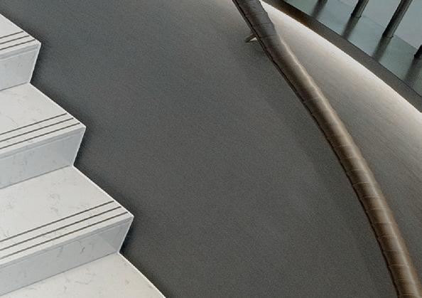At 450 South Oak Way, a bespoke helical staircase –its mild steel core wrapped in stone-clad treads and crowned with polished stainless-steel handrails – spirals gracefully over 4.2 metres. The juxtaposition of robust industrial materials – radiused glass balustrades and fabric formed channel stringers – with the natural stone treads creates a dialogue between solidity and lightness. This staircase doesn’t just connect floors, it choreographs the first impression of the entire office, where the functional is elevated to an artful axis of movement and style.