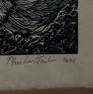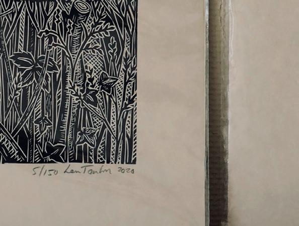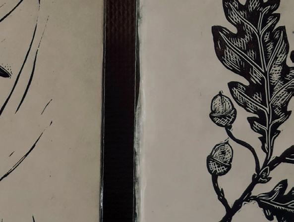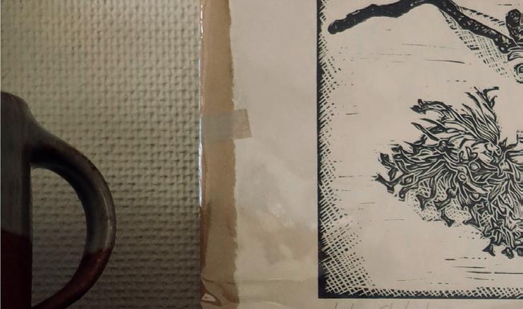 Her insistence on sustainable purpose runs through every aspect of her practice. She’s selftaught, endlessly experimental and unafraid of failure. Printing with fish is not, by nature, predictable. Papers tear, ink dries too quickly, and scaly surfaces stick or sag in unexpected places. But these are not deterrents; they are opportunities to learn, adjust, and try again.